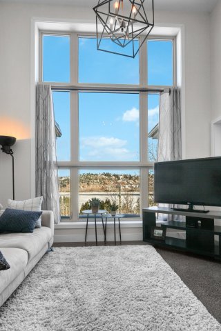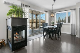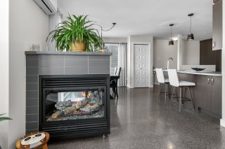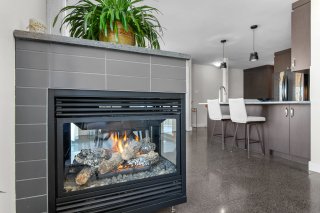 À l'intérieur, vous serez charmé par l'impressionnant plafond cathédrale qui accentue la sensation d'espace et de luminosité. L'abondance de fenêtres inonde l'aire de vie à aire ouverte de lumière naturelle tout en mettant en valeur des vues spectaculaires. Les planchers chauffants assurent un confort absolu toute l'année, tandis que le magnifique foyer au gaz à trois faces crée une ambiance chaleureuse et accueillante, visible de tous les espaces principaux.